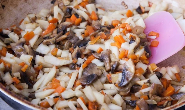 Размороженные белые грибы обсушите салфеткой, нарежьте и обжарьте отдельно от овощей, затем все смешайте, посолите и тушите еще минуту.