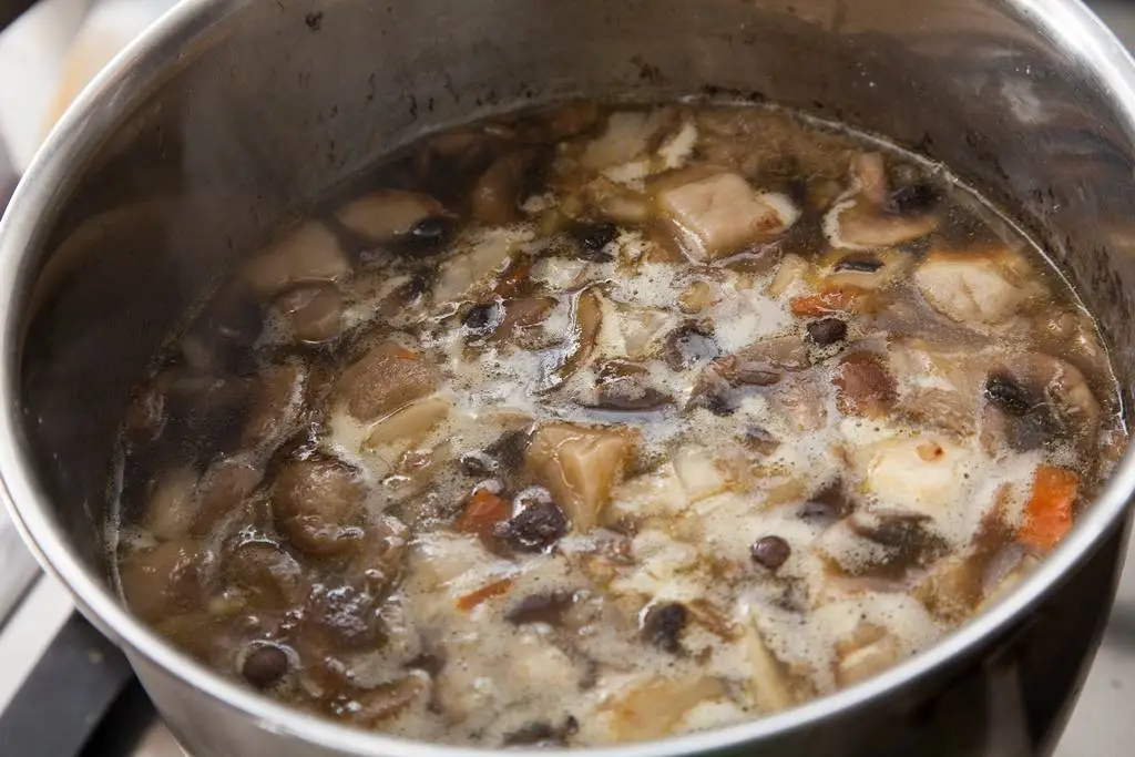 Промытую гречку залейте бульоном, доведите до кипения и варите на небольшом огне под крышкой.