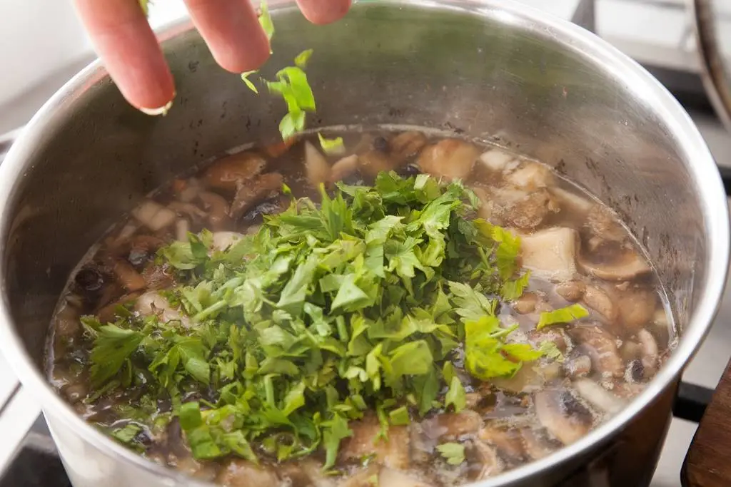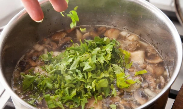 Петрушку порубите и добавьте в готовый суп, накройте крышкой, дайте настояться 15 минут. Если вы употребляете молочные продукты, подавайте со сметаной, а овощи обжаривайте на топленом масле — будет еще вкуснее!