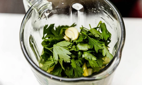 В блендер сложите крупно нарезанные огурцы, очищенный чеснок, очищенный кусочек имбиря, петрушку, несколько листиков мяты и кокосовое молоко.