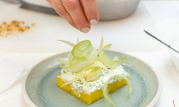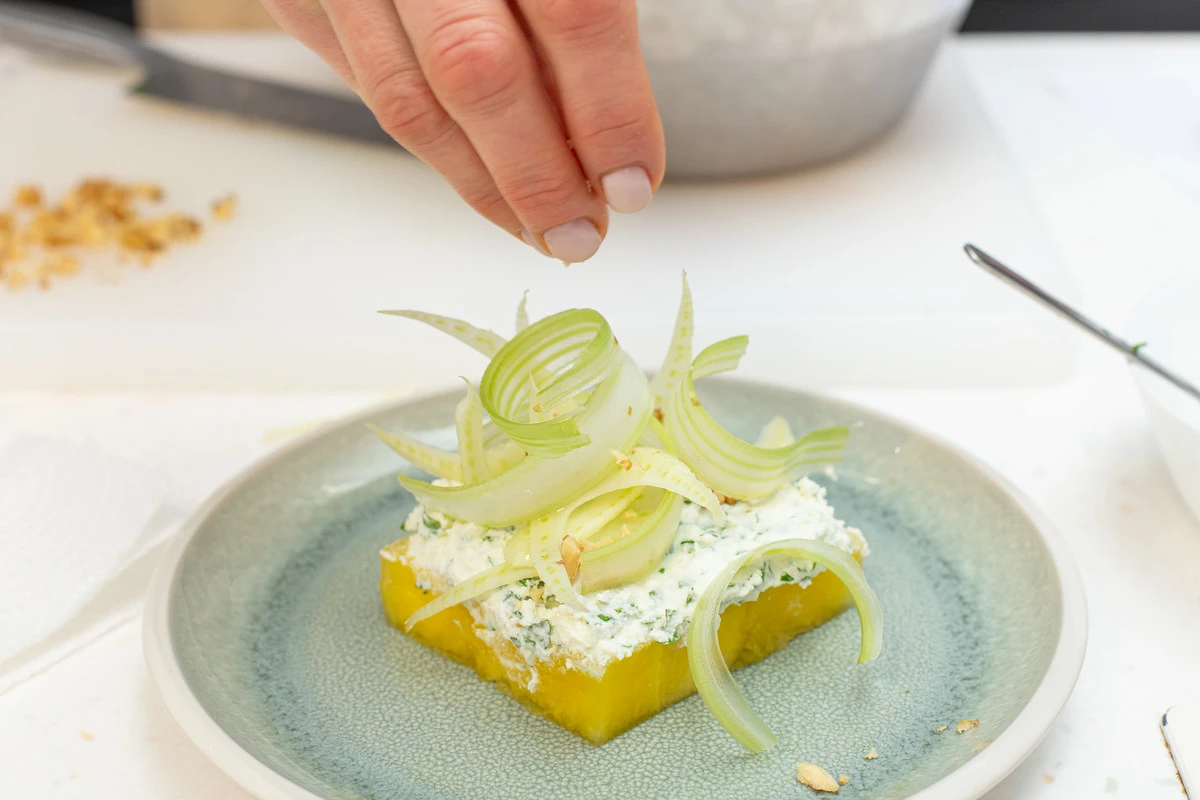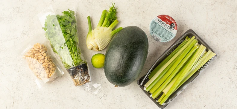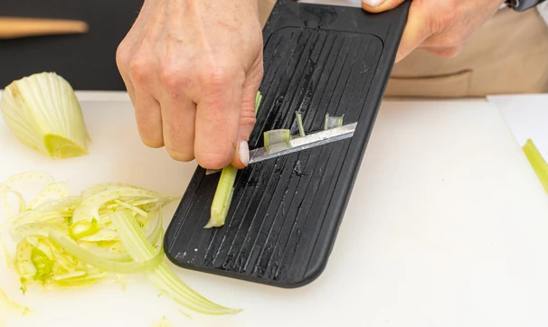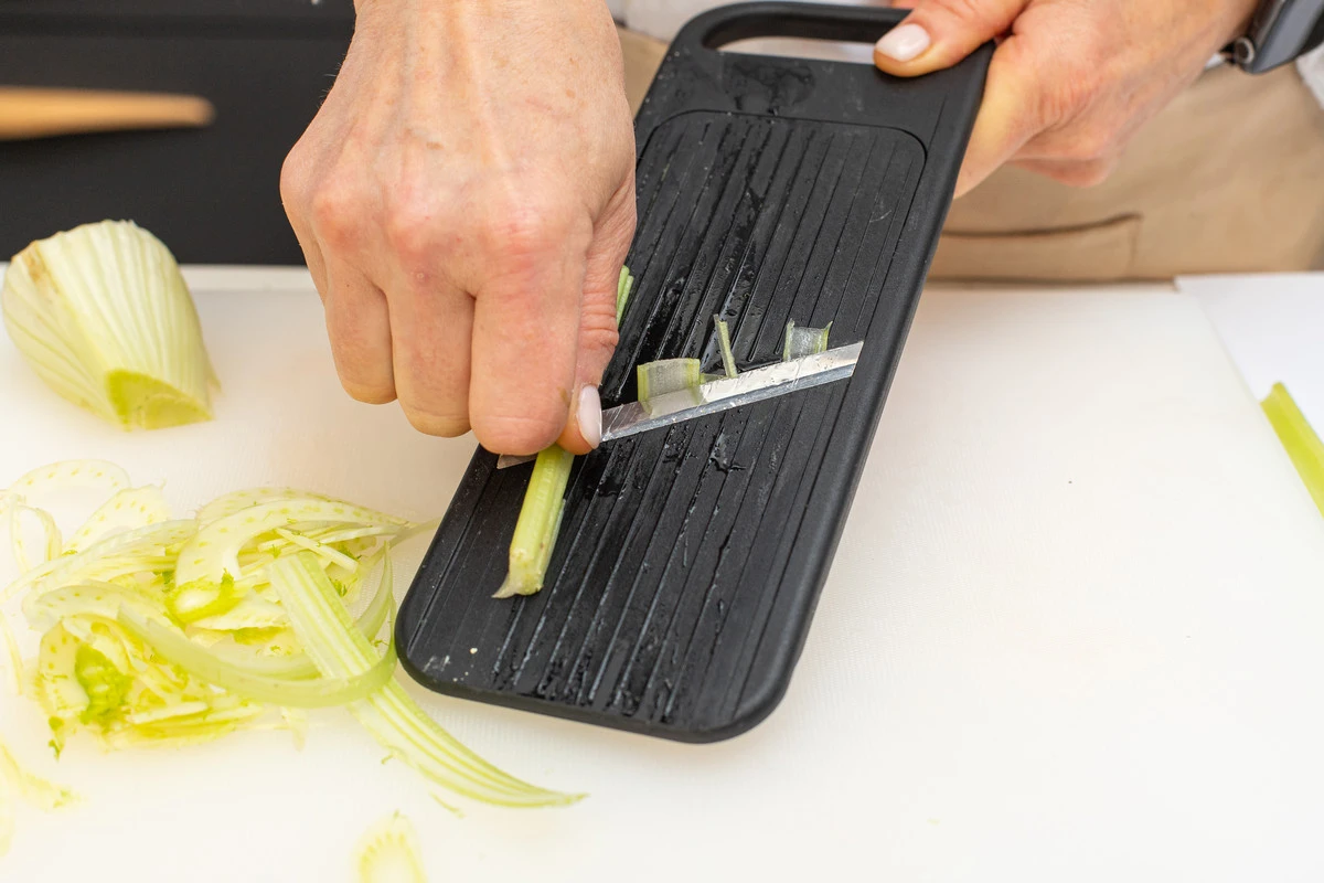 Стебли сельдерея и фенхель нарежьте слайсером. Грецкие орехи порубите ножом. Слайсы фенхеля и сельдерея можно также слегка «подкрутить». Для этого налейте в небольшую миску немного холодной воды, добавьте кубики льда и выложите туда слайсы сельдерея и фенхеля. Оставьте минут на 5-10, они слегка закрутятся.