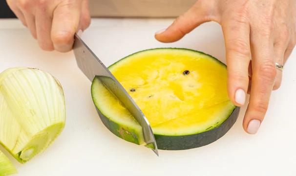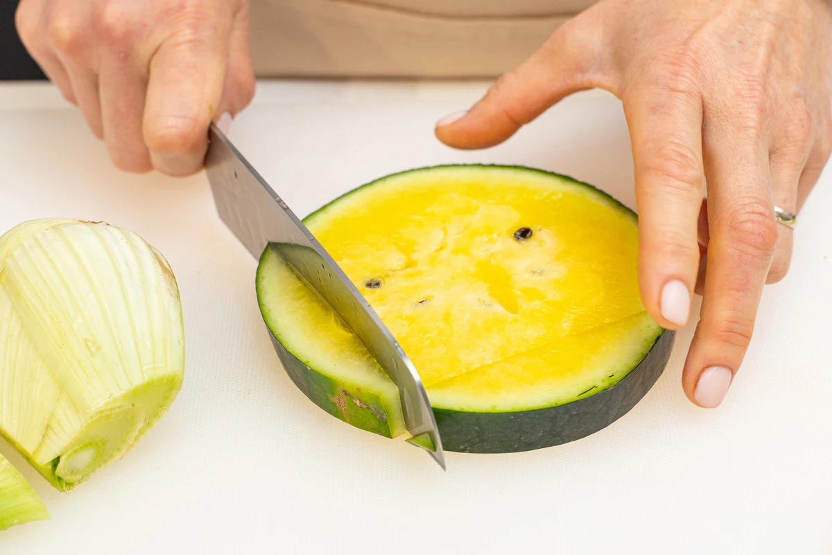 Отрежьте два ломтика арбуза толщиной примерно 2 см. Обрежьте с четырёх сторон корки так, чтобы получилось два квадратных ломтика.