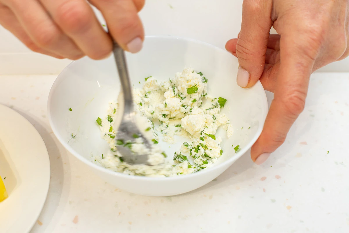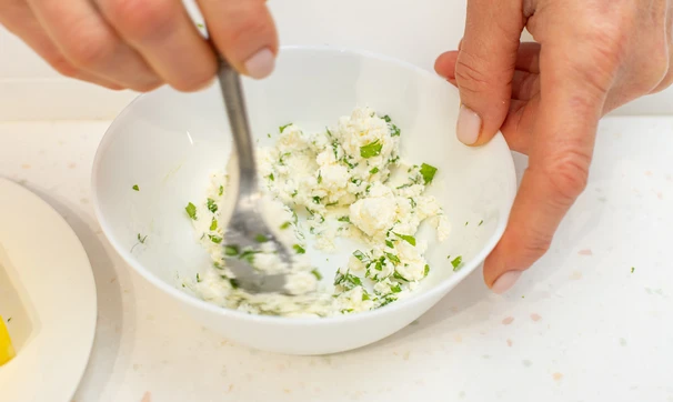 Петрушку мелко нарубите и смешайте в мисочке с творожным сыром.