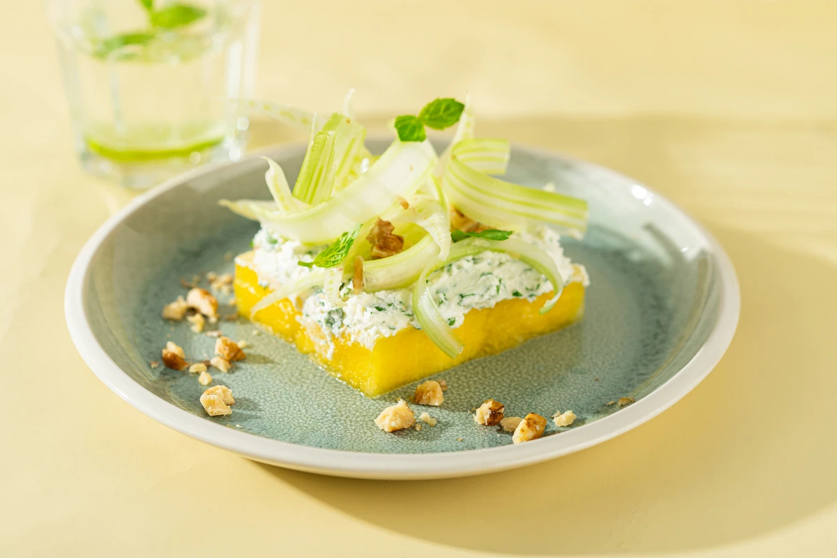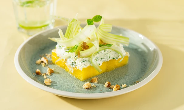 Выложите на каждый ломтик арбуза по половине сыра с зеленью, разровняйте. Сверху положите слайсы сельдерея и фенхеля. Посыпьте грецкими орехами, украсьте листиками мяты и подавайте.