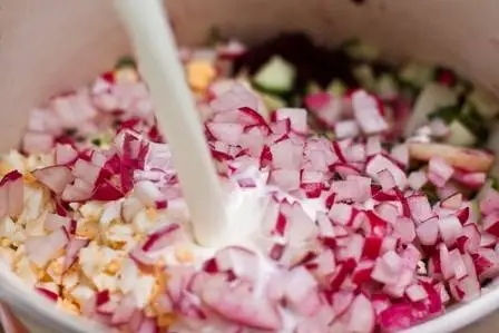 Все ингредиенты мелко режем и складываем в кастрюлю или супницу.