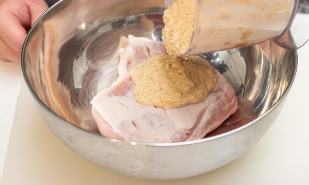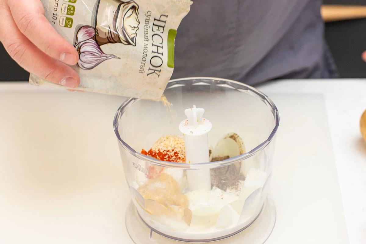 Приготовьте маринад. Лук нарежьте крупно, выложите в измельчитель блендера. Добавьте 30-50 мл сливок, дижонскую горчицу, молотую паприку, молотый чёрный перец, сушёный чеснок, соль.