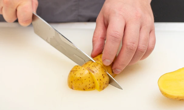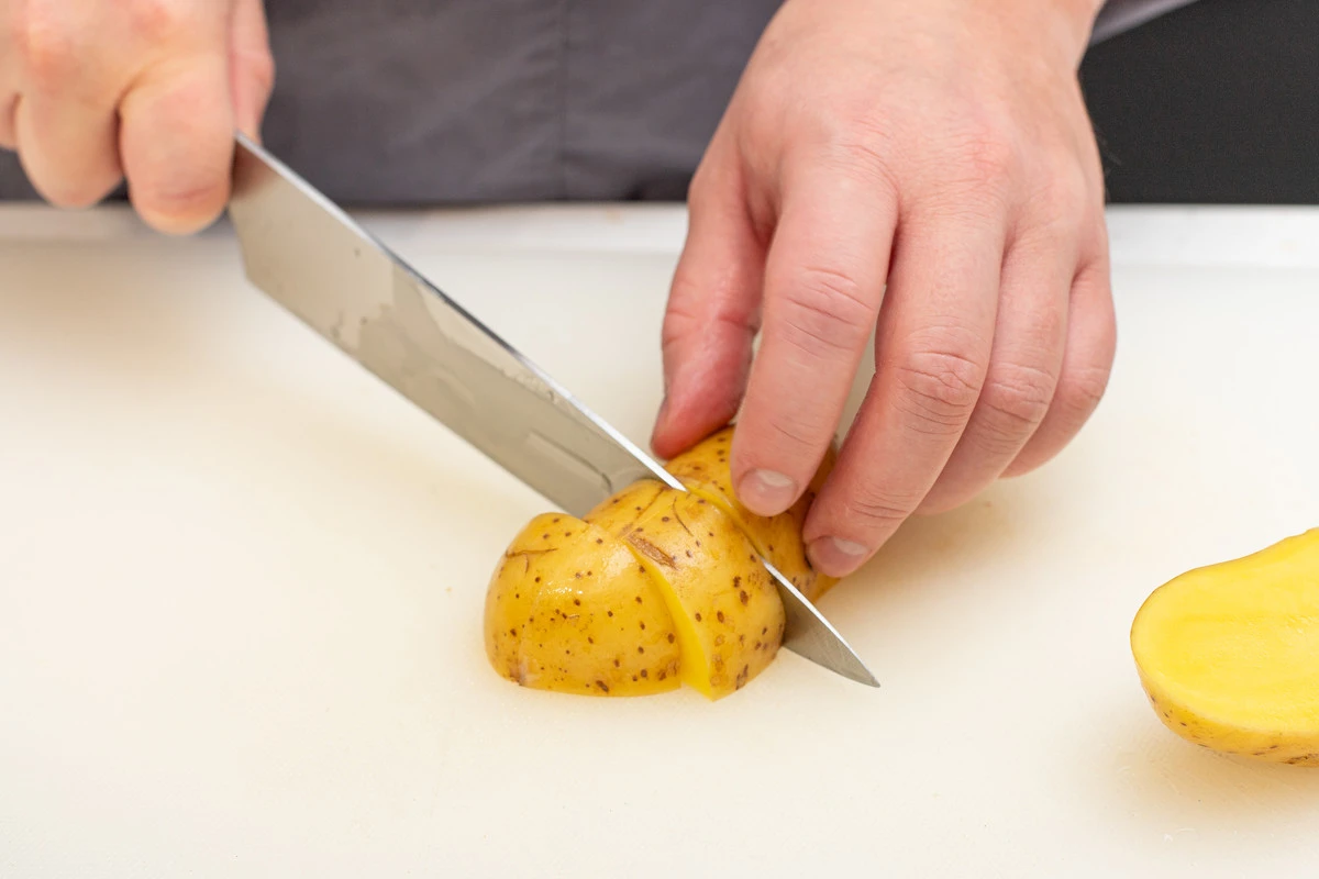 Картофель хорошо помойте со щёткой, чистить не нужно. Нарежьте крупными кусочками.