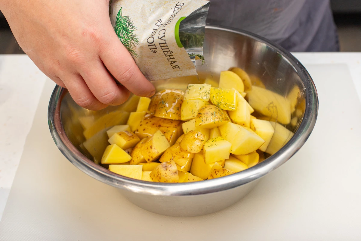 Выложите в миску. Добавьте к картофелю растительное масло, соль, сушёный укроп и чеснок, перемешайте.