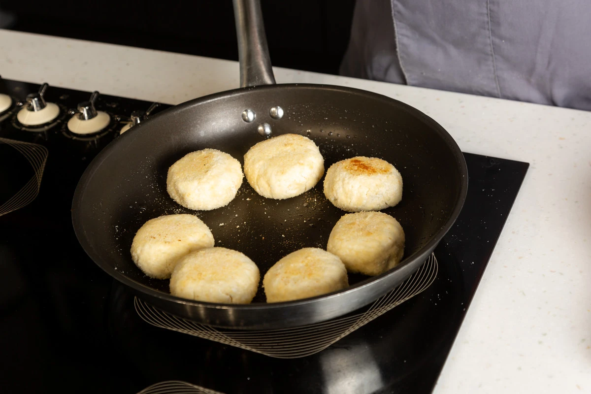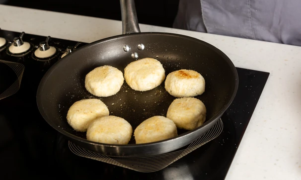 Сформируйте из теста сырники, обваляйте в кокосовой муке и жарьте на смазанной маслом сковороде до золотистого цвета.