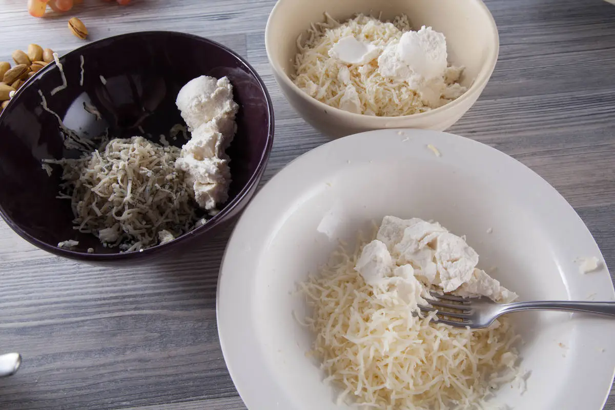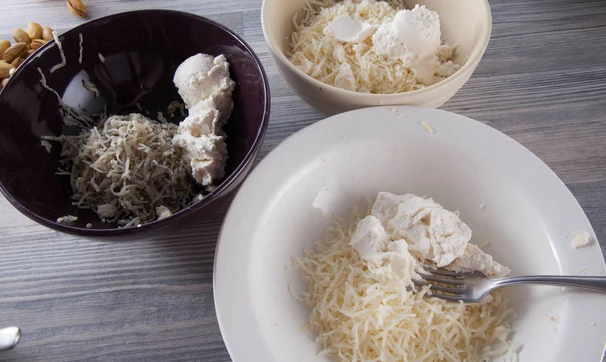 Разные виды сыра натрите на мелкой терке в три небольших мисочки, добавьте к каждому сыру риккотту, перемешайте, должна получиться густая масса.