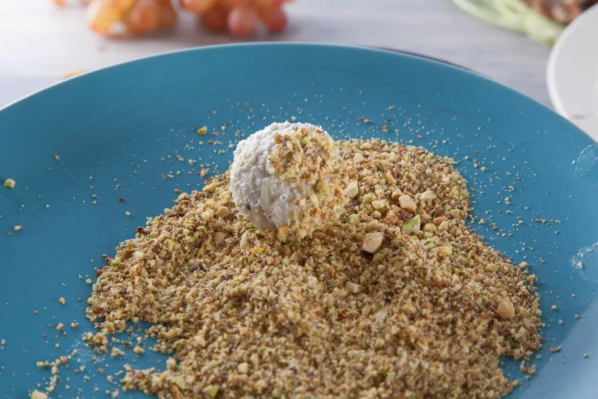 Из сырной массы катайте шарики, вкладывая в центр начинку: для голубого сыра возьмите кусочек груши, обваляйте шарик в фисташковой крошке.