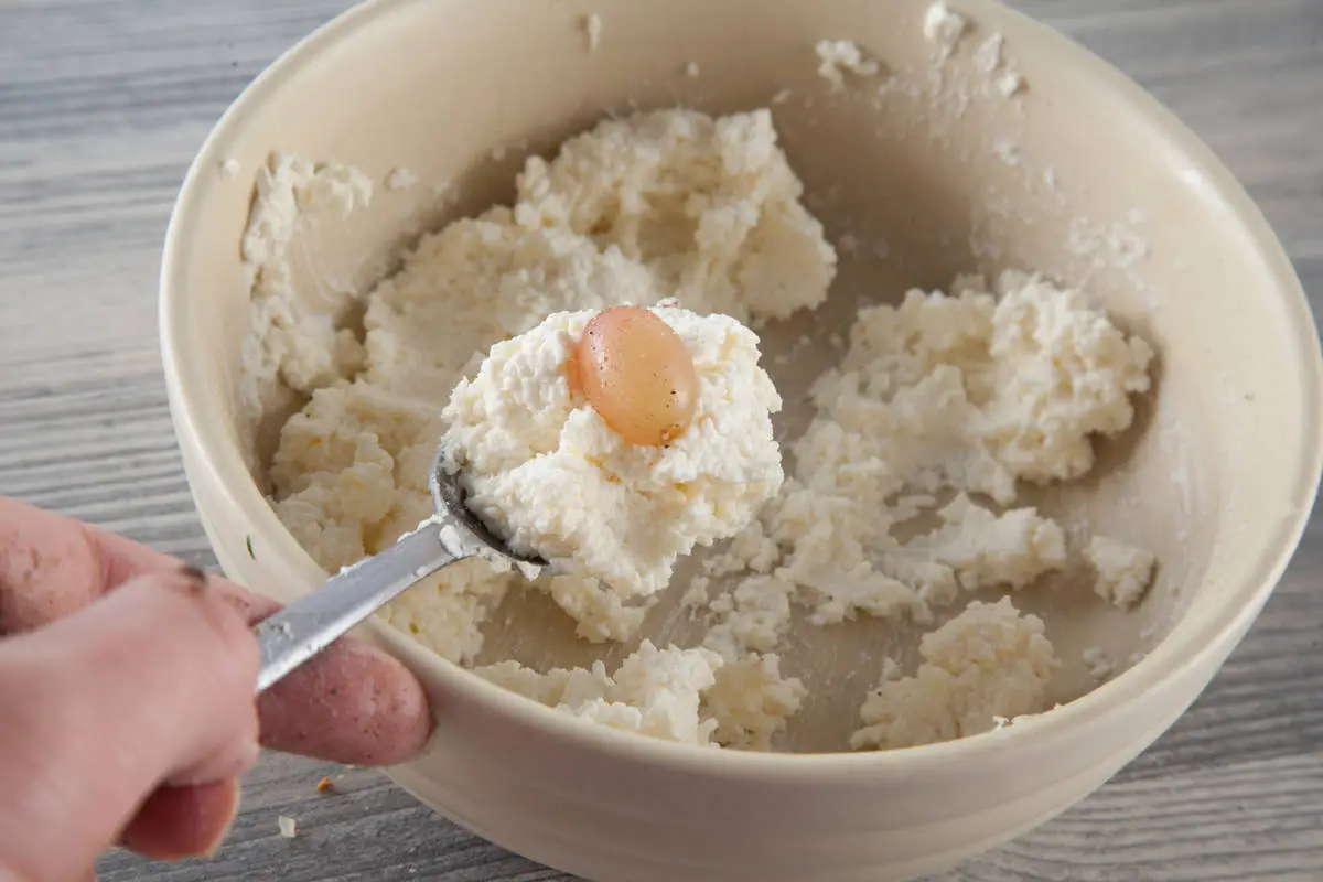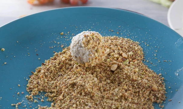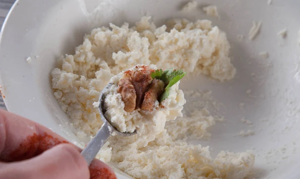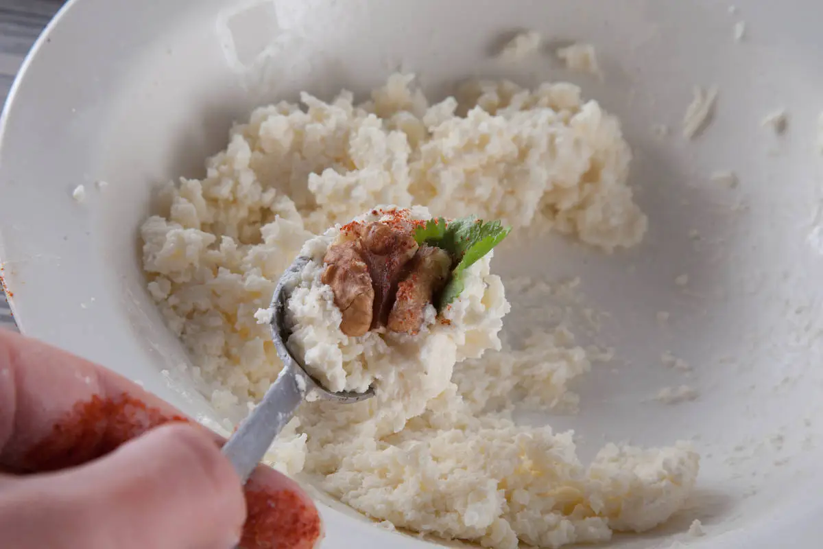 Начинкой для шарика из сыра Азоло станет грецкий орех с листиком кинзы, обваляйте в парике.