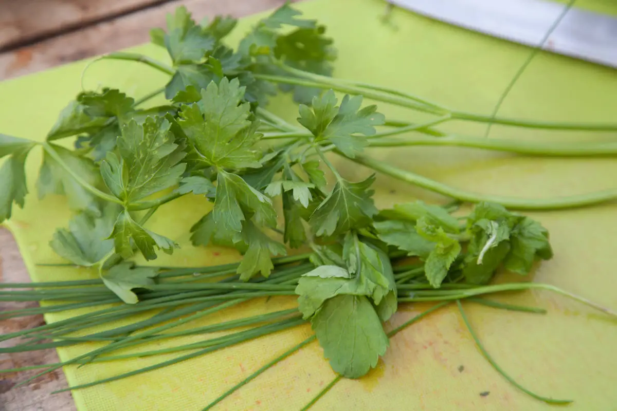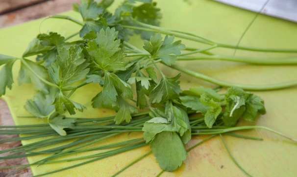Зелень (ее должно быть много!) порубите, чеснок измельчите.