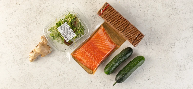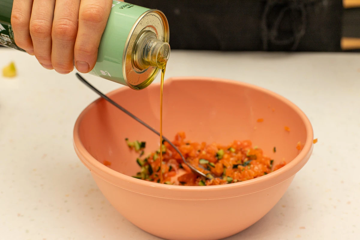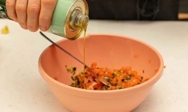 Измельчите корень имбиря на мелкой тёрке и добавьте к форели и огурцу. Влейте оливковое масло и выдавите лимонный сок. Тщательно перемешайте смесь.