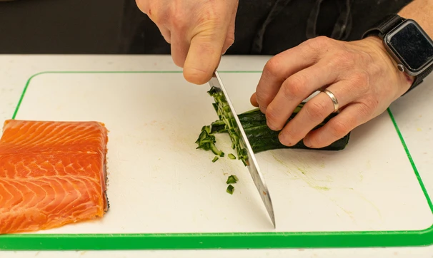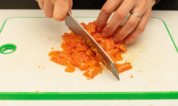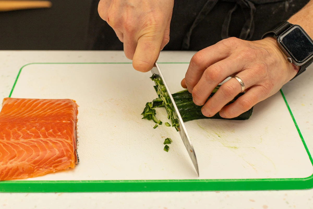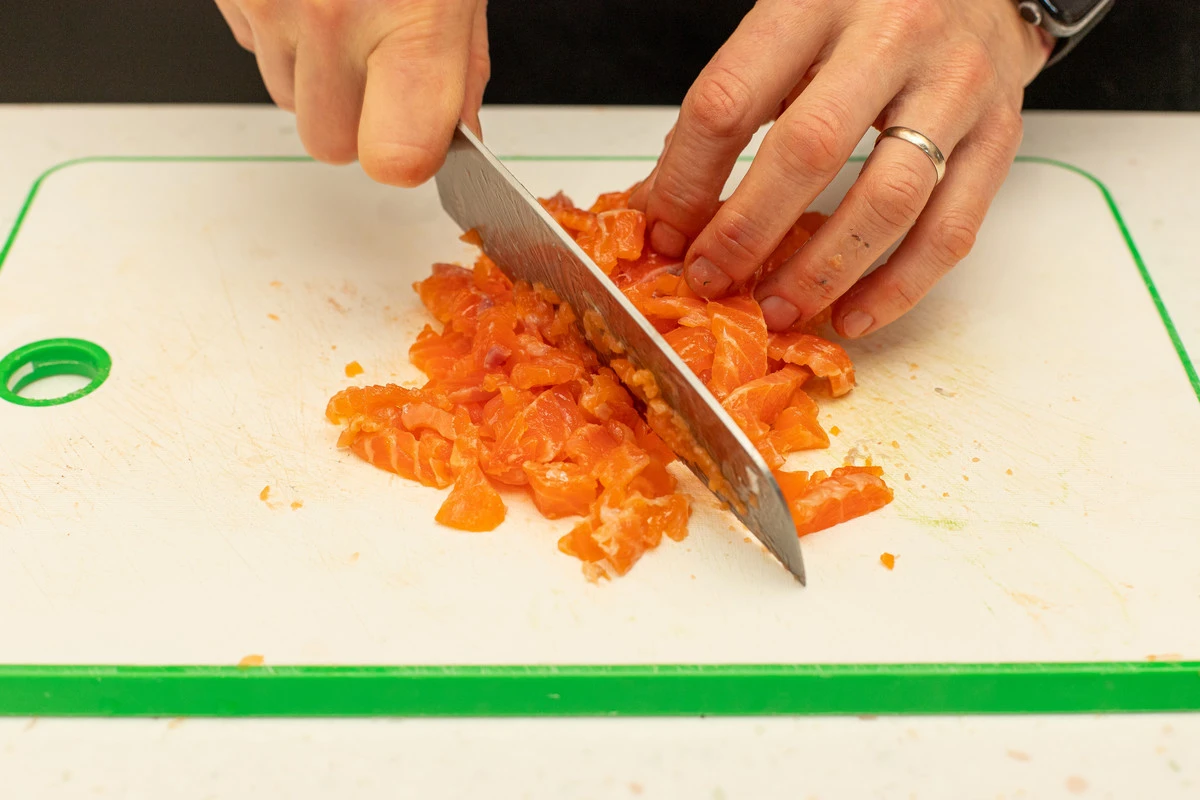 Филе форели снимите с кожи при помощи острого ножа. Нарежьте рыбу кубиками и сложите в миску вместе с огурцом.