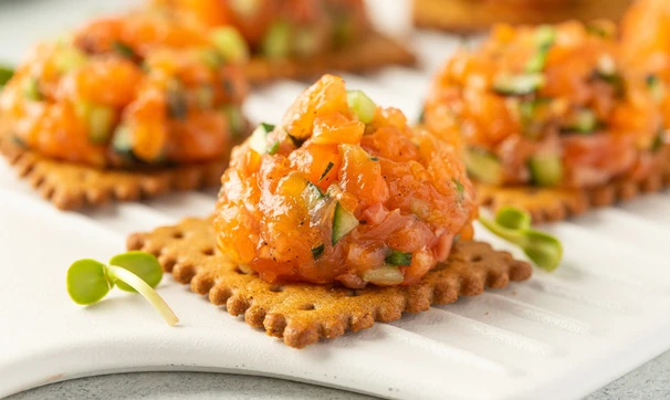 Имбирь и лимонный сок добавляют пикантности вкусу тартара, а в сочетании с солёным хрустящим крекером получается настоящий хит праздничного стола.