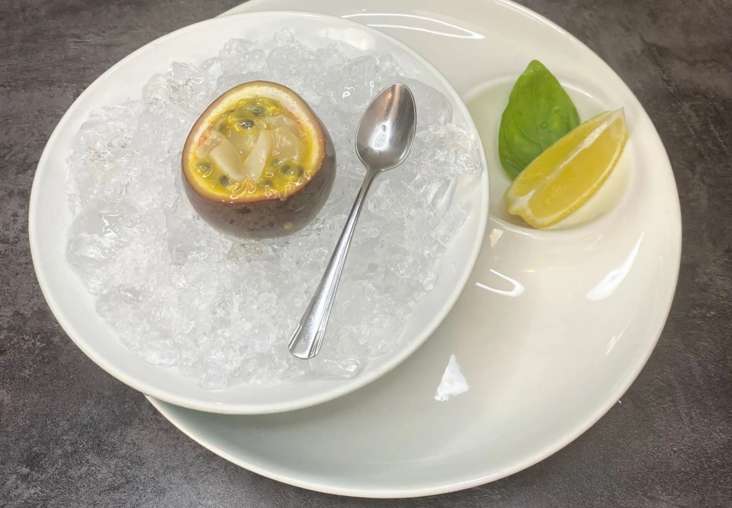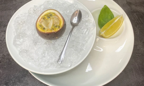 Срежьте у маракуйи верх. Положите фрукт на тарелку со льдом.