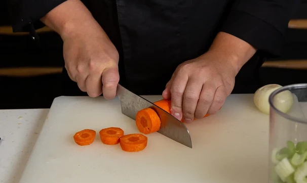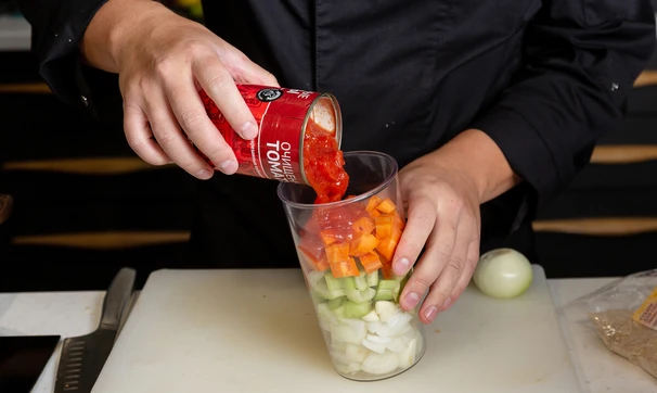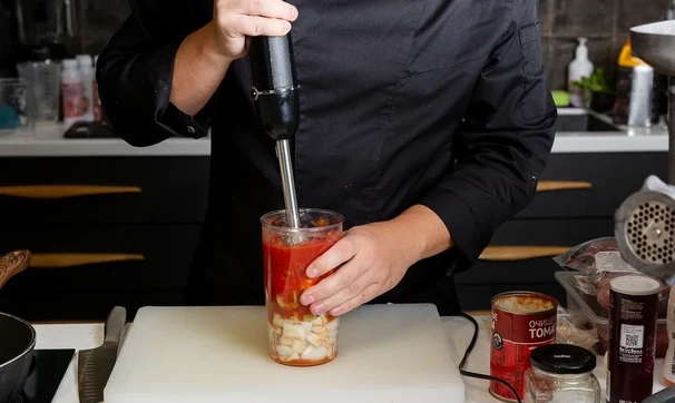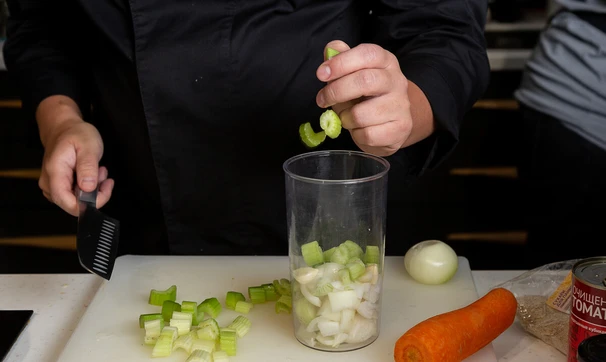 Сделайте подливу. Лук и чеснок почистите и нарежьте крупно. Стебли сельдерея нарежьте ломтиками толщиной примерно 1-2 см. Положите всё в чашу или стакан блендера.