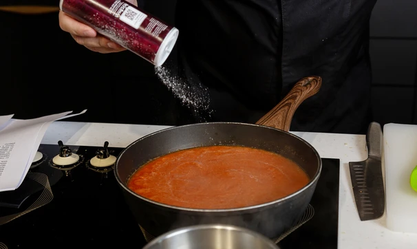 Переложите получившуюся подливу в сотейник или кастрюлю. Добавьте ¼ ч. л. соли, ¼ ч. л. чёрного молотого перца, перемешайте и тушите примерно 10 минут. Крышкой накрывать не нужно.