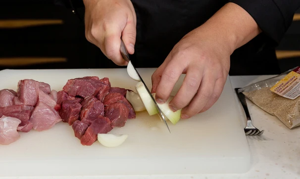 Мясо очистите от жил, если есть, и нарежьте крупными кубиками. Одну луковицу также нарежьте крупно.