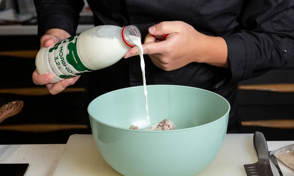 Добавьте варёный рис, молоко и яйцо. Насыпьте панировочные сухари.