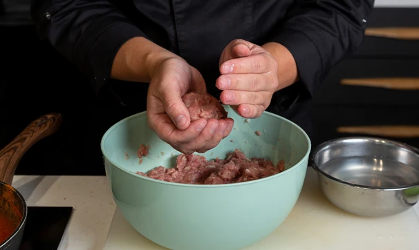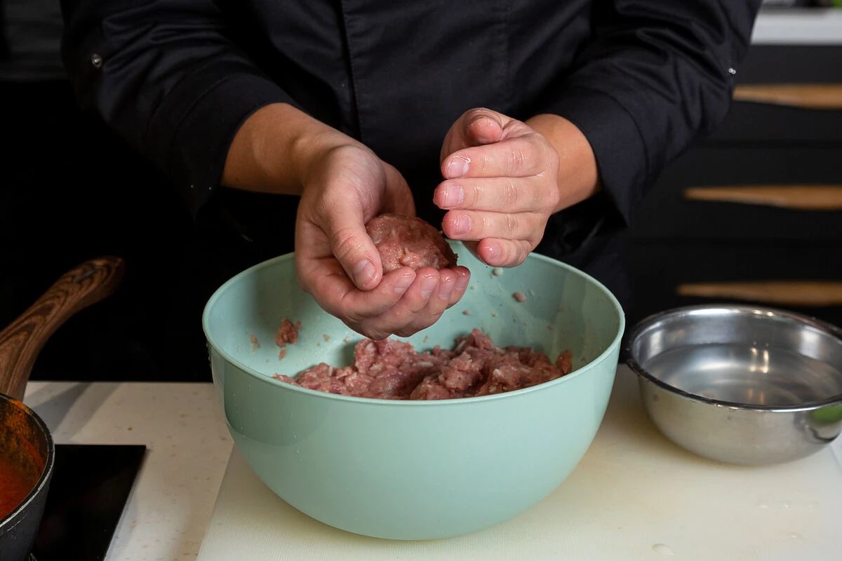 Хорошо вымесите фарш руками и сформуйте тефтели диаметром примерно 5-6 см.