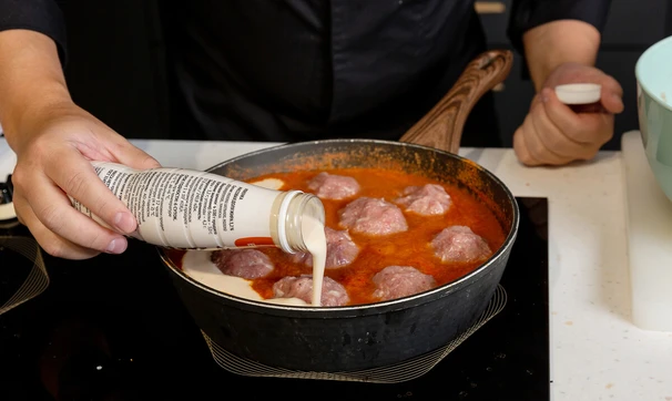 Выложите тефтели в подготовленный ранее соус. Налейте ряженку. Накройте крышкой и тушите примерно 20-30 минут. Через 10 минут после начала тушения аккуратно перемешайте. Готовые тефтели подавайте с подливкой.