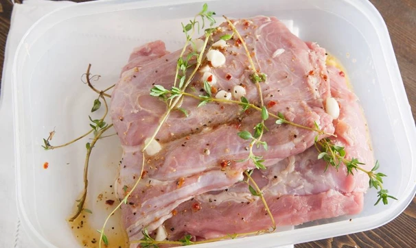Маринад к такому мясу подойдет самый простой — взбейте вилкой масло с лимонным соком, добавьте мелко порубленный чеснок, перец, соль и листики тимьяна, натрите этой смесью мясо и оставьте на пару часов при комнатной температуре.