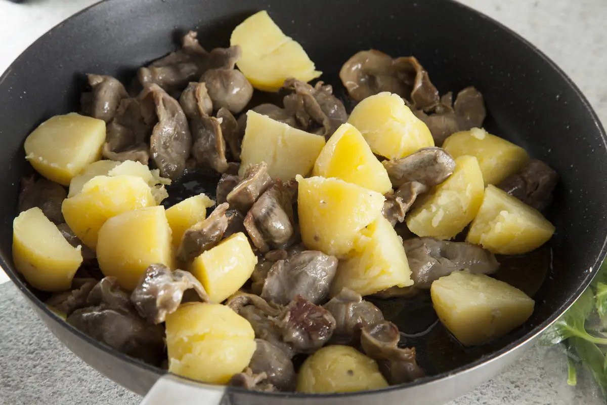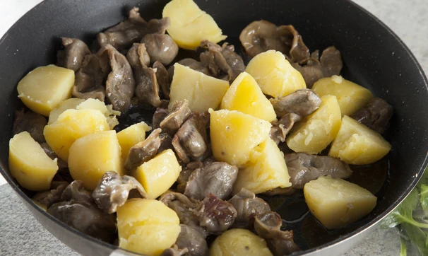 Желудки промойте, отварите 50–60 мин и обжарьте до золотистого цвета. Затем соедините с картофелем.