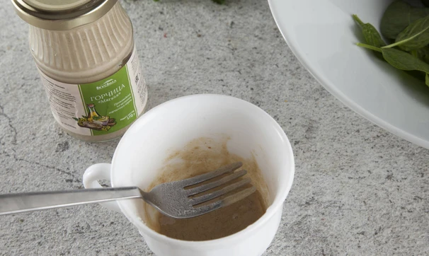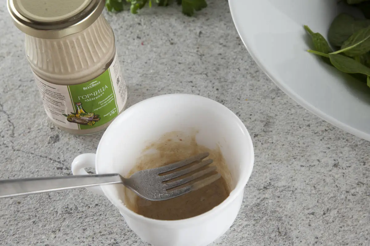 Смешайте горчицу с лимонным соком и солью, добавьте немного утиного жира от желудков, заправьте половиной смеси листья шпината, перемешайте.