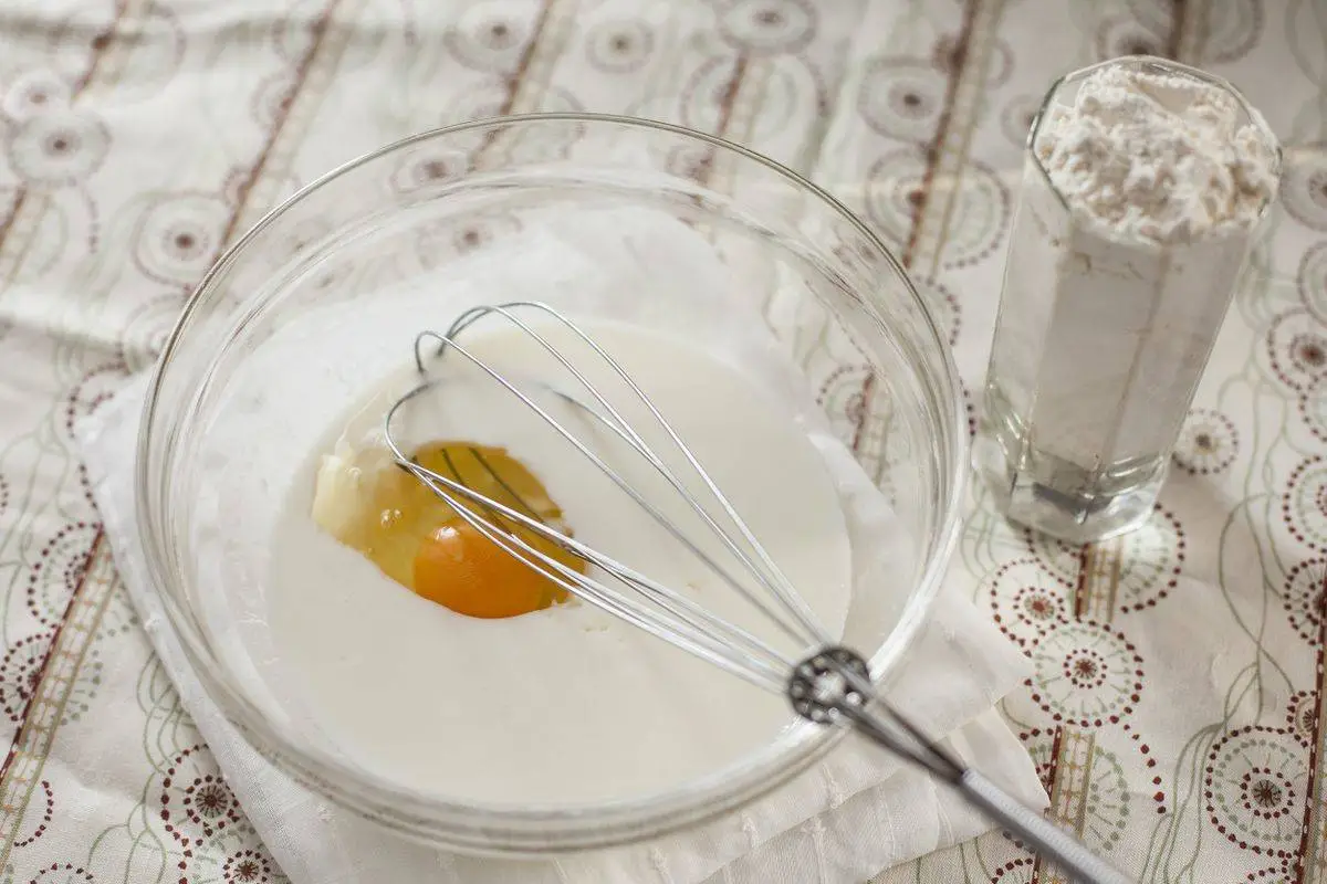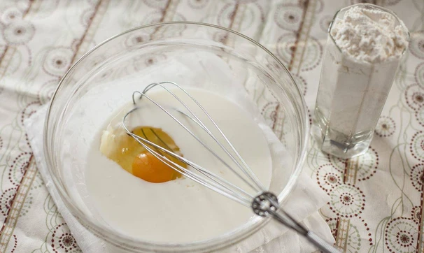 Смешайте кефир, муку, яйцо, соль и сахар, слегка взбейте венчиком.