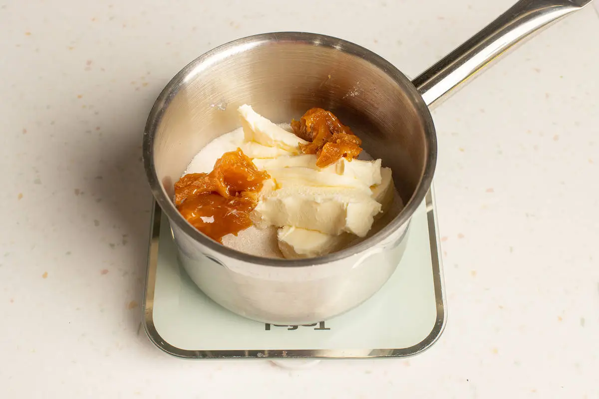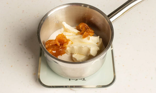 Нагревайте на водяной бане всё вместе, помешивая, около 15 минут до однородной массы. Снимите с огня, дайте остыть до комнатной температуры и уберите в холодильник ещё на полчаса.