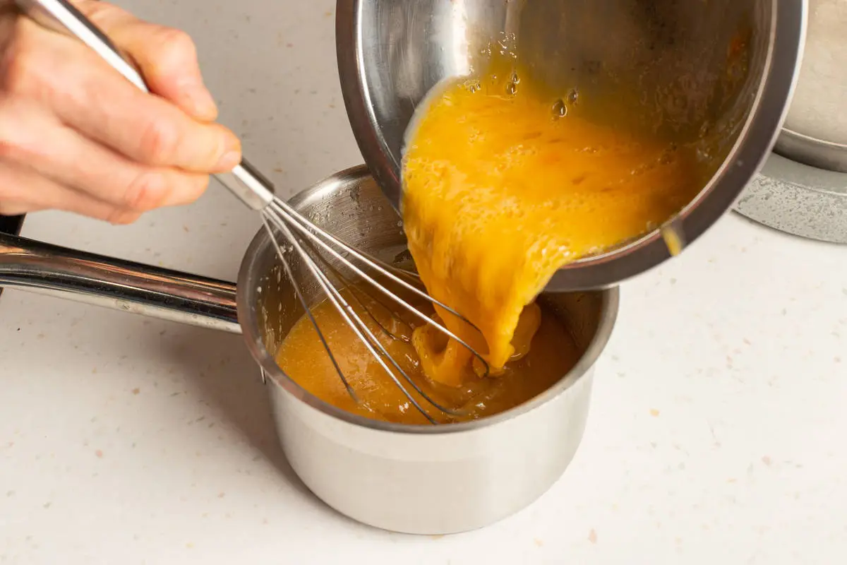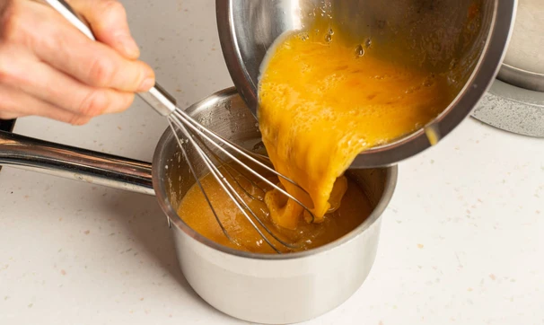 Разбейте яйца в отдельную мисочку, слегка взбейте венчиком и добавьте в сотейник.