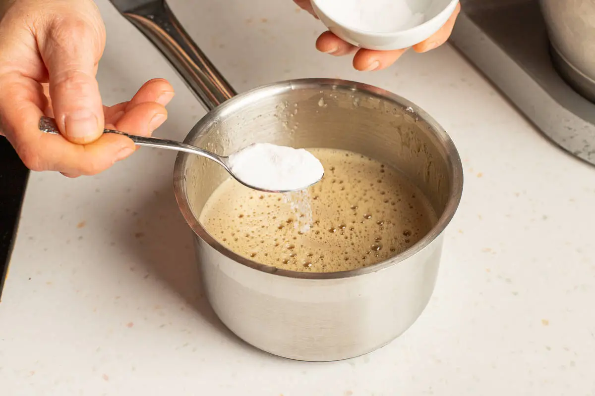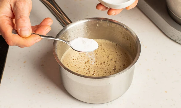 Мешайте, пока сахар и масло не растворятся. А затем нагревайте, не доводя до кипения, пока не образуется белая пена на поверхности смеси. Добавьте соду, перемешайте, прогрейте ещё минуту и снимите с огня.