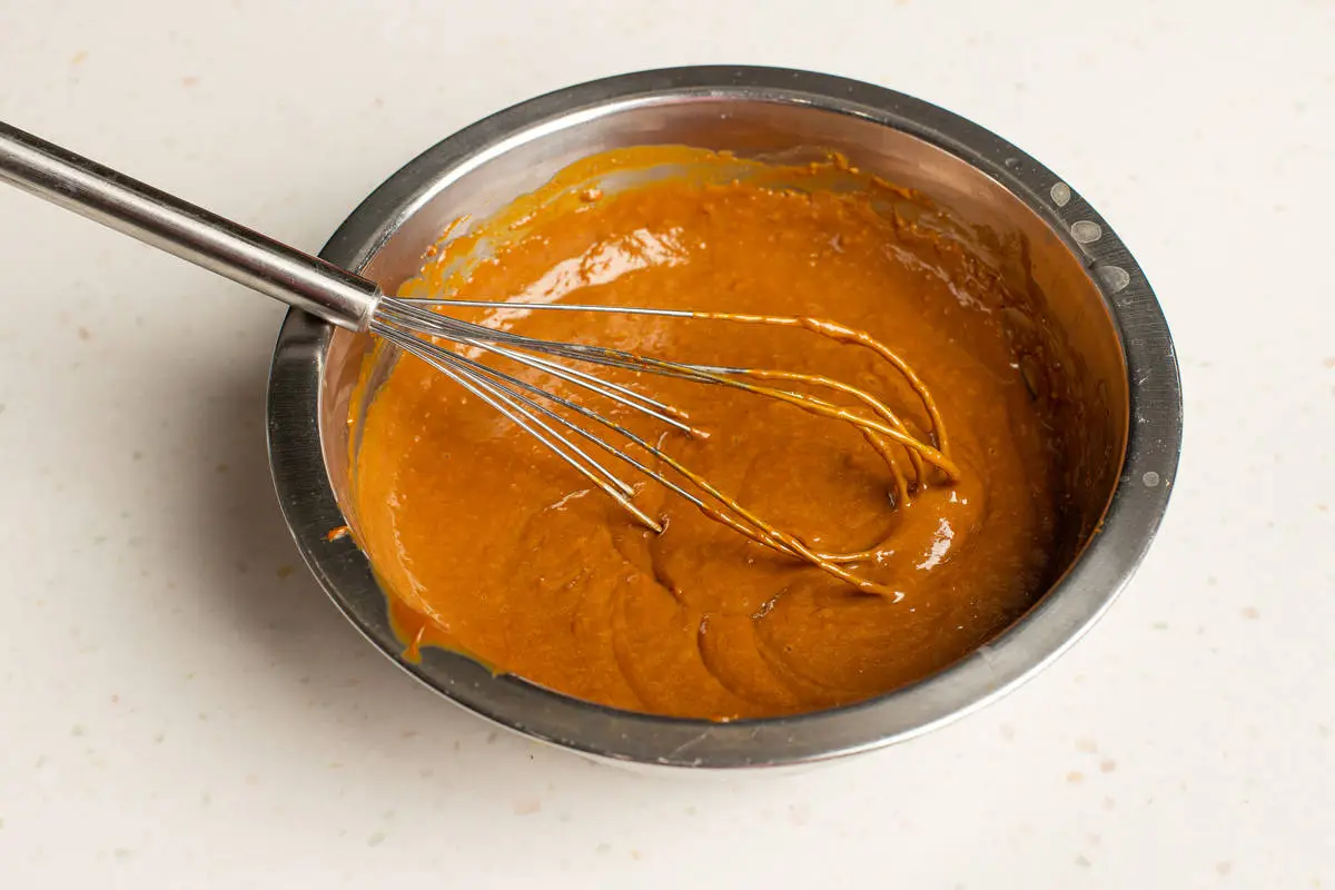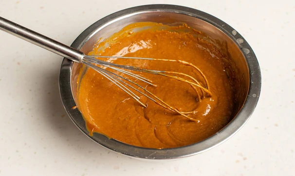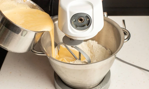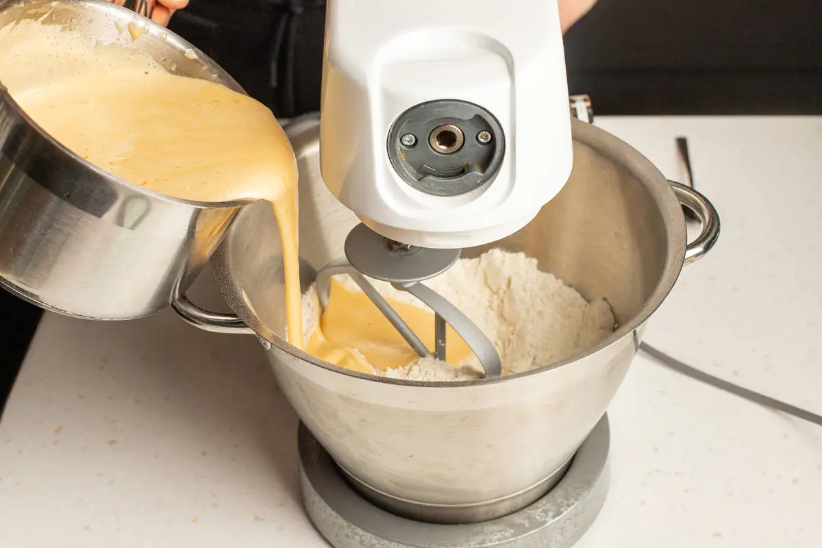 Просейте муку, добавьте смесь из сотейника и замесите тесто миксером на небольшой скорости.