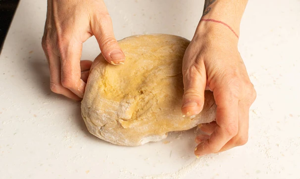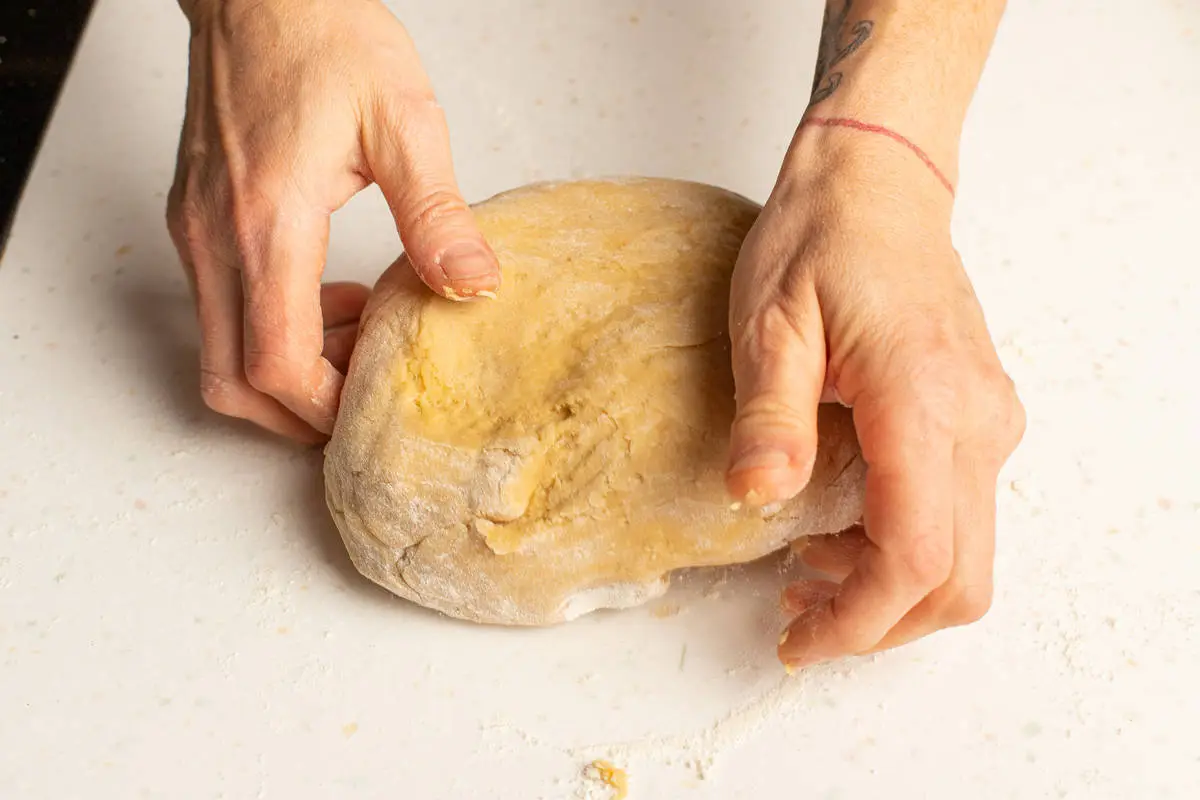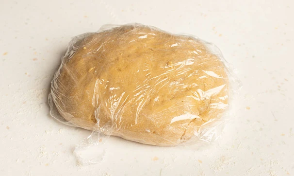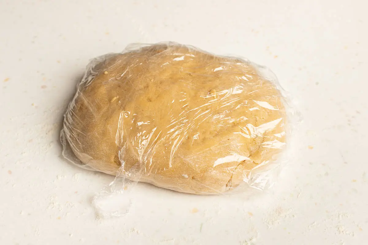 Сформируйте шар из теста и дайте ему остыть. Затем разделите на 8 одинаковых частей и накройте пищевой плёнкой.