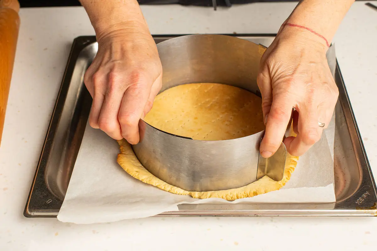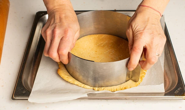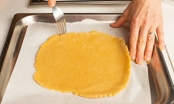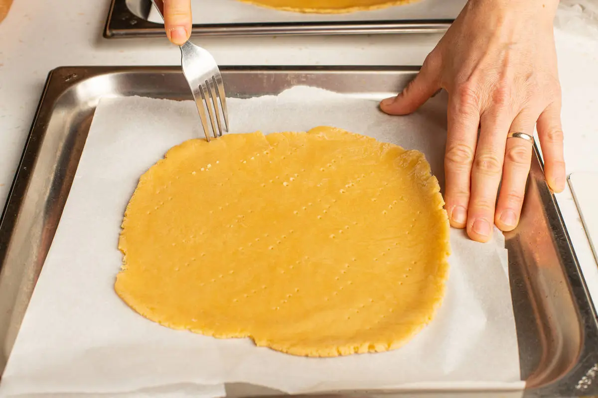 Разогрейте духовку до 200 °C. Раскатайте каждый кусочек теста в круг на бумаге для выпечки. Сделайте проколы вилкой, чтобы тесто не вздувалось. Выпеките все коржи по очереди по 3 минуты каждый.