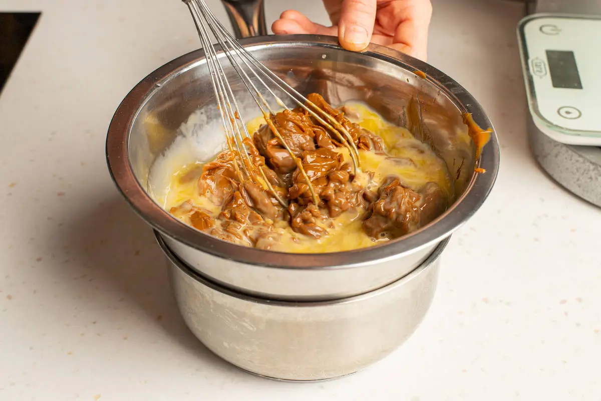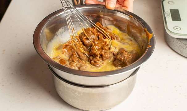 Теперь можно заняться кремом. Соорудите водяную баню из кастрюли с кипящей водой и установленной на неё металлической или стеклянной ёмкости. Отделите желтки от трёх яиц (белки не понадобятся), смешайте их с двумя столовыми ложками воды, добавьте банку варёной сгущёнки.