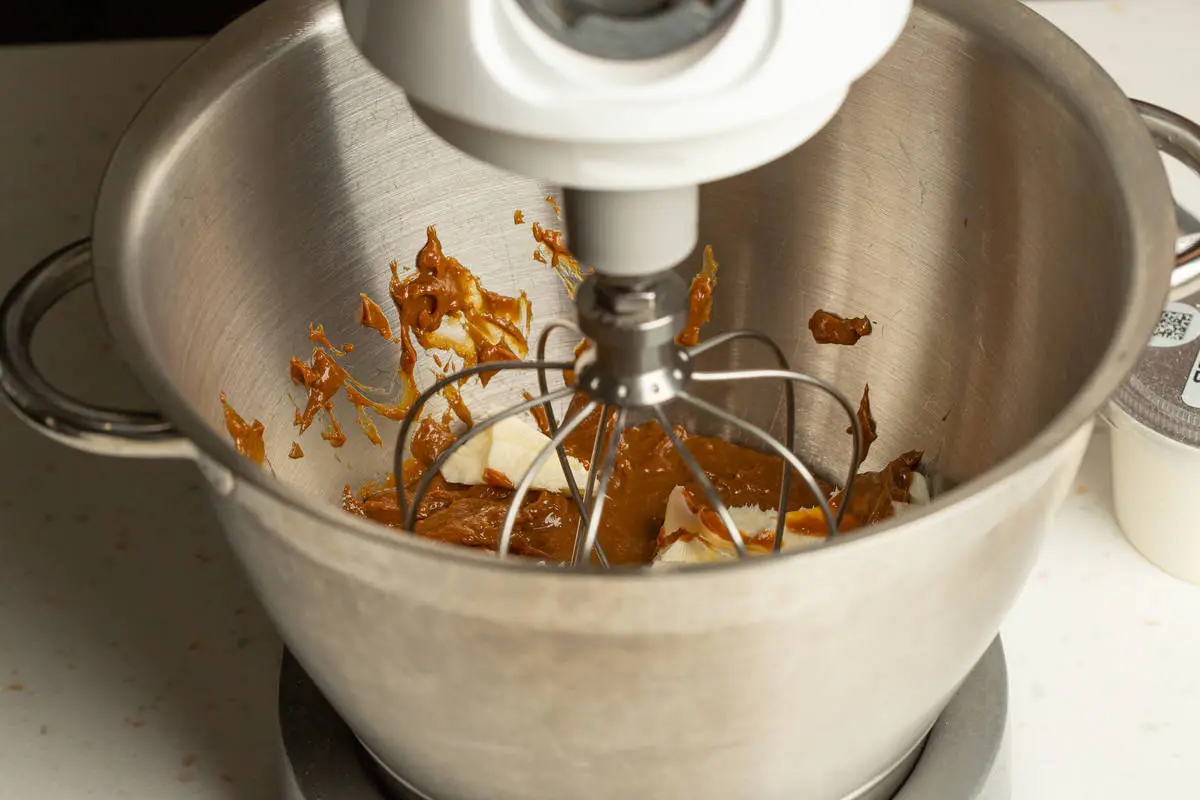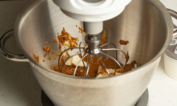 В застывшую смесь добавьте размягчённое при комнатной температуре масло и сметану, взбейте всё вместе до однородности.
