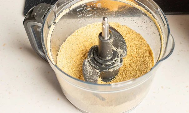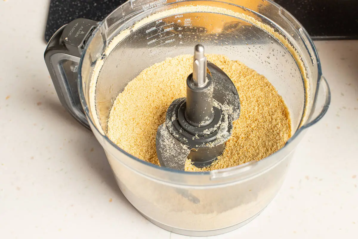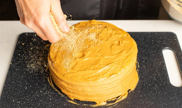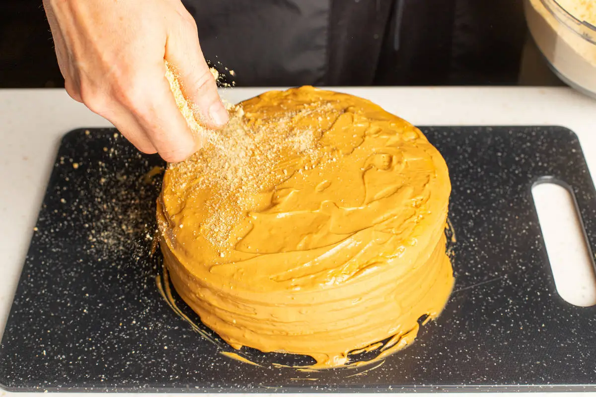 Обрезки от коржей подпеките в духовке ещё около 5 минут, чтобы они стали яркого медового цвета. Остудите обрезки и измельчите в крошку в блендере.