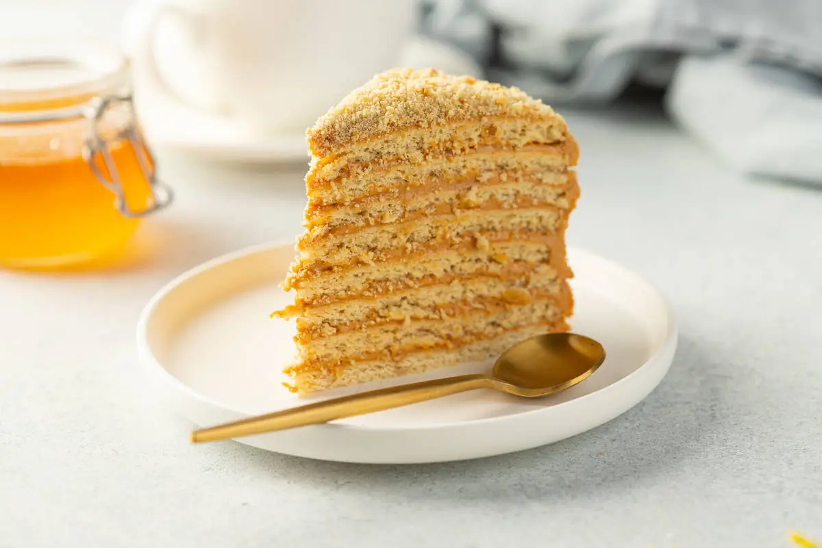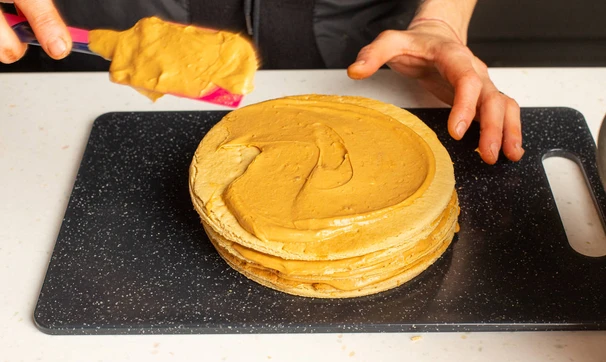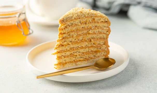 Медовик — это торт с коржами на меду, и для более яркого и «плотного» вкуса мы рекомендуем использовать гречишный. А чтобы подчеркнуть медовый вкус и аромат, крем для торта будем готовить с варёным сгущённым молоком.
