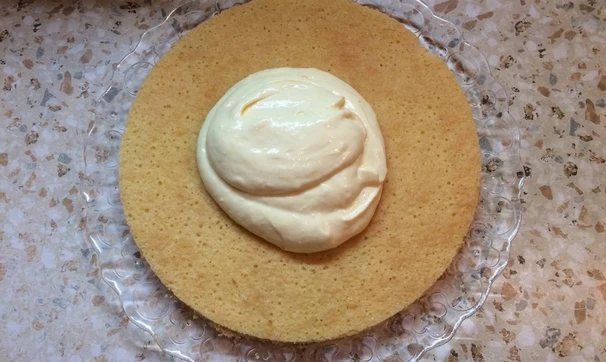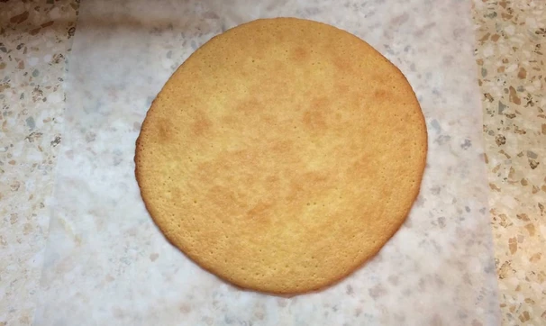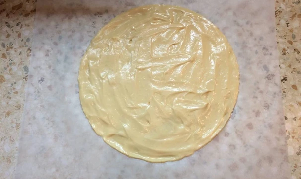 Я приготовила из него 5 коржей диаметром 26 см. Чтобы коржи вышли одинаковой толщины, удобнее всего получившееся тесто разделить на 5 одинаковых порций, воспользовавшись кухонными весами. Отрезаем 5 частей пергамента, на каждом листе с обратной стороны чертим круг с помощью крышки или кулинарного кольца. Берём первый лист пергамента, выкладываем в центр тесто и размазываем его, не выходя за круг. Отправляем корж в разогретую до 200 °C духовку на 4-6 минут (до золотистого цвета).