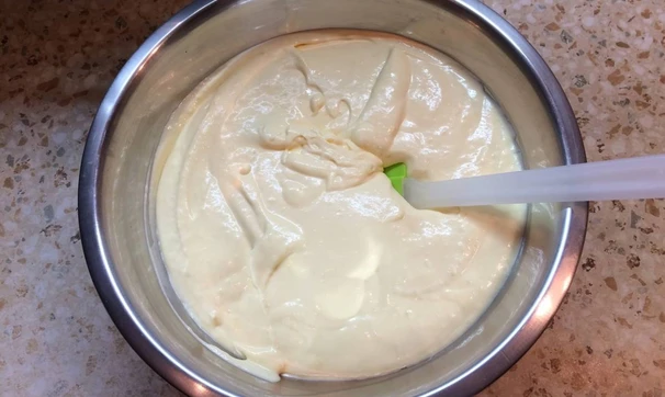 Просеиваем и смешиваем сухие ингредиенты: муку, крахмал, разрыхлитель и соль. Сливочное масло растапливаем и оставляем остывать до тёплого состояния. Яйца взбиваем с сахаром в пышную пену, не менее 10 минут. Добавляем к взбитым яйцам по ложке сливочного масла, продолжая взбивать. Затем снижаем скорость миксера до минимальной и частями вводим мучную смесь. Тесто готово.