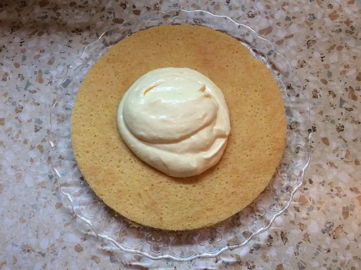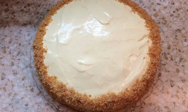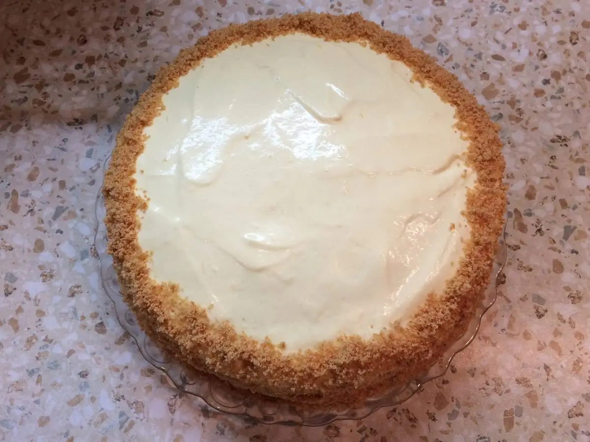 Равномерно распределяем крем, затем с помощью лопатки и длинного ножа переносим второй корж на первый, распределяем крем по второму коржу и полностью собираем так весь торт. А можно просто взвесить крем и разделить на все коржи, не забывая оставить немного крема на бока. Обмазываем края торта кремом. Бока и верх я обсыпала измельчёнными остатками бисквита. Ставим торт на пропитку в холодильник на пару часов или на ночь (у меня он простоял ночь).