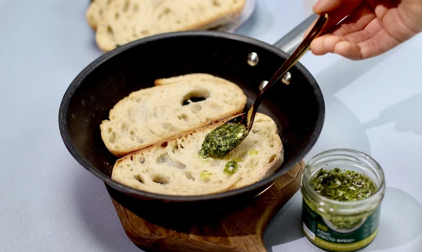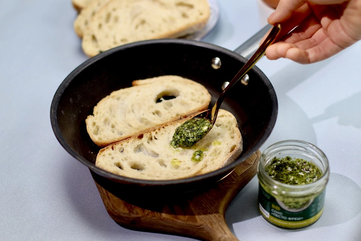 Распределите песто по куску хлеба, слегка обжарьте на среднем огне с одной стороны.