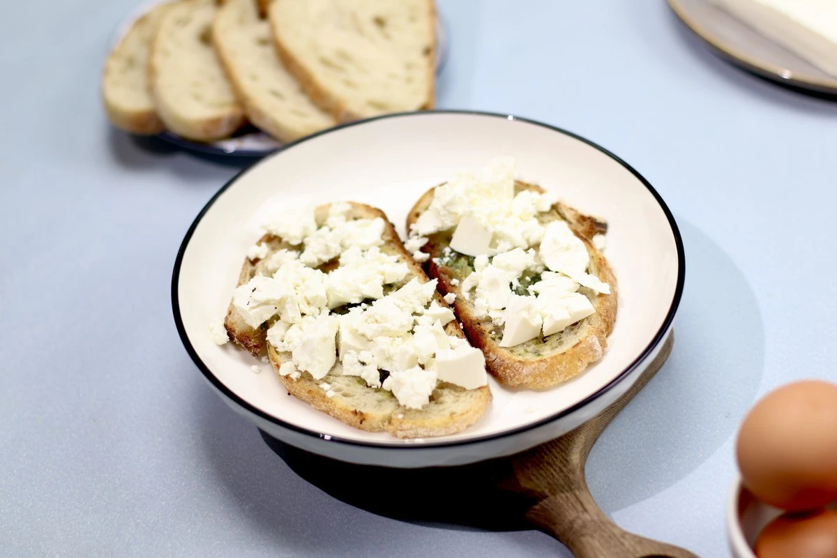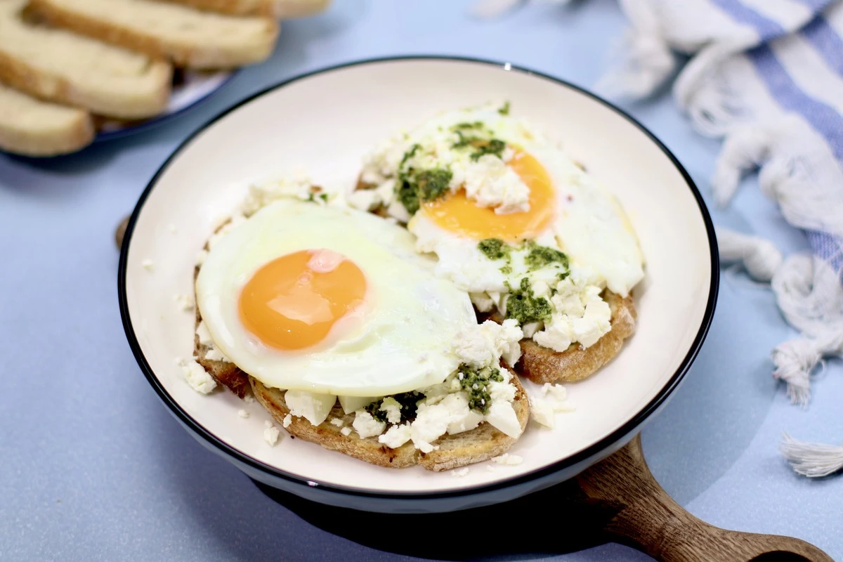 Это блюдо отлично подходит для завтрака или лёгкого обеда. Оно насыщенное, вкусное и простое в приготовлении. Подавайте его горячим, чтобы полностью насладиться всеми вкусовыми оттенками сочетания песто, сыра фета и свежего ароматного хлеба.