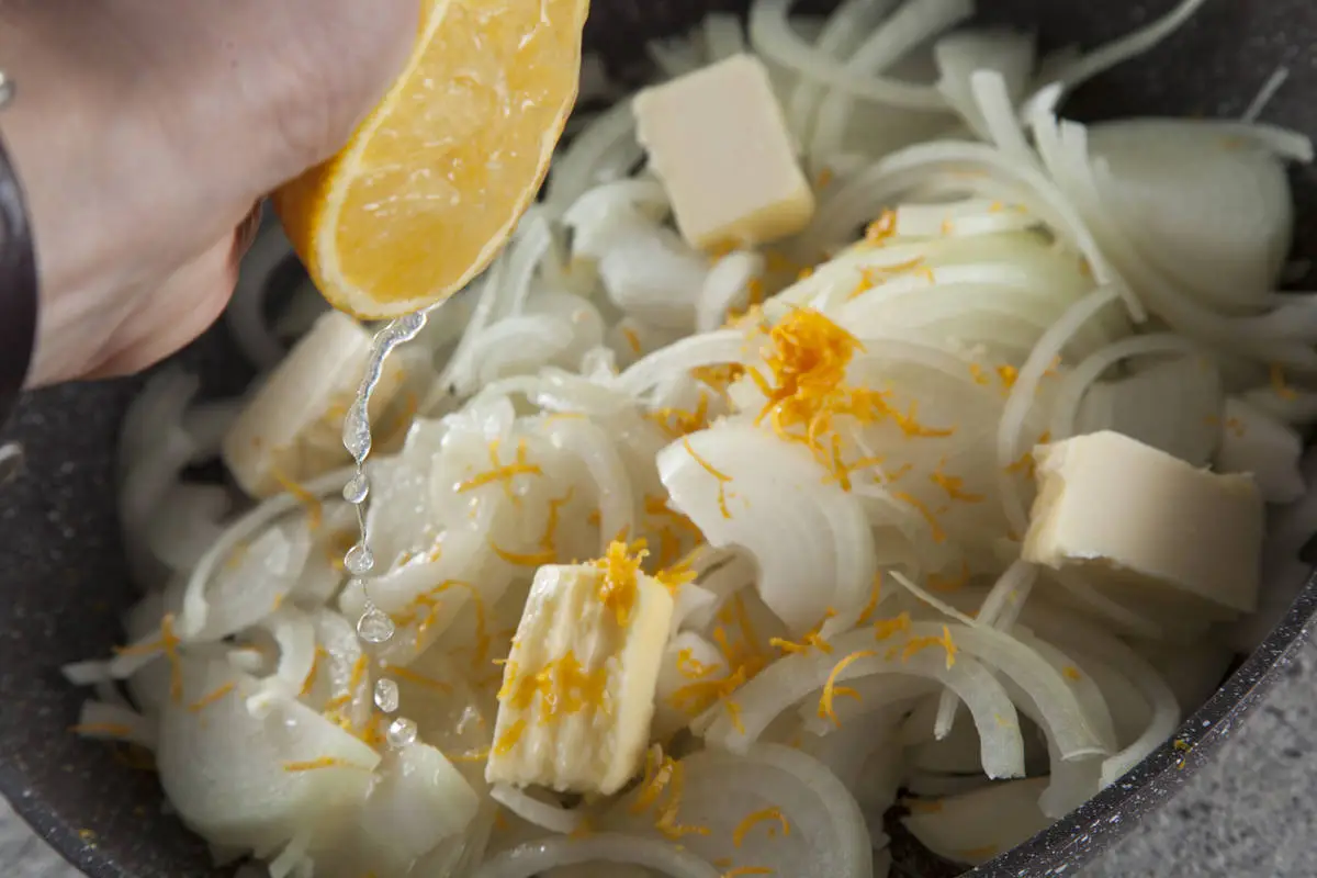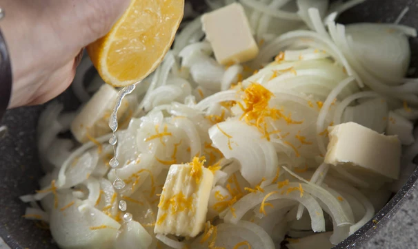 Лук очистите, нарежьте тонкими полукольцами и сложите в сотейник или сковороду с толстым дном, добавьте сливочное масло, сахар, сок и цедру апельсина, готовьте на небольшом огне под крышкой, регулярно помешивая — около часа. Не допускайте подгорания.