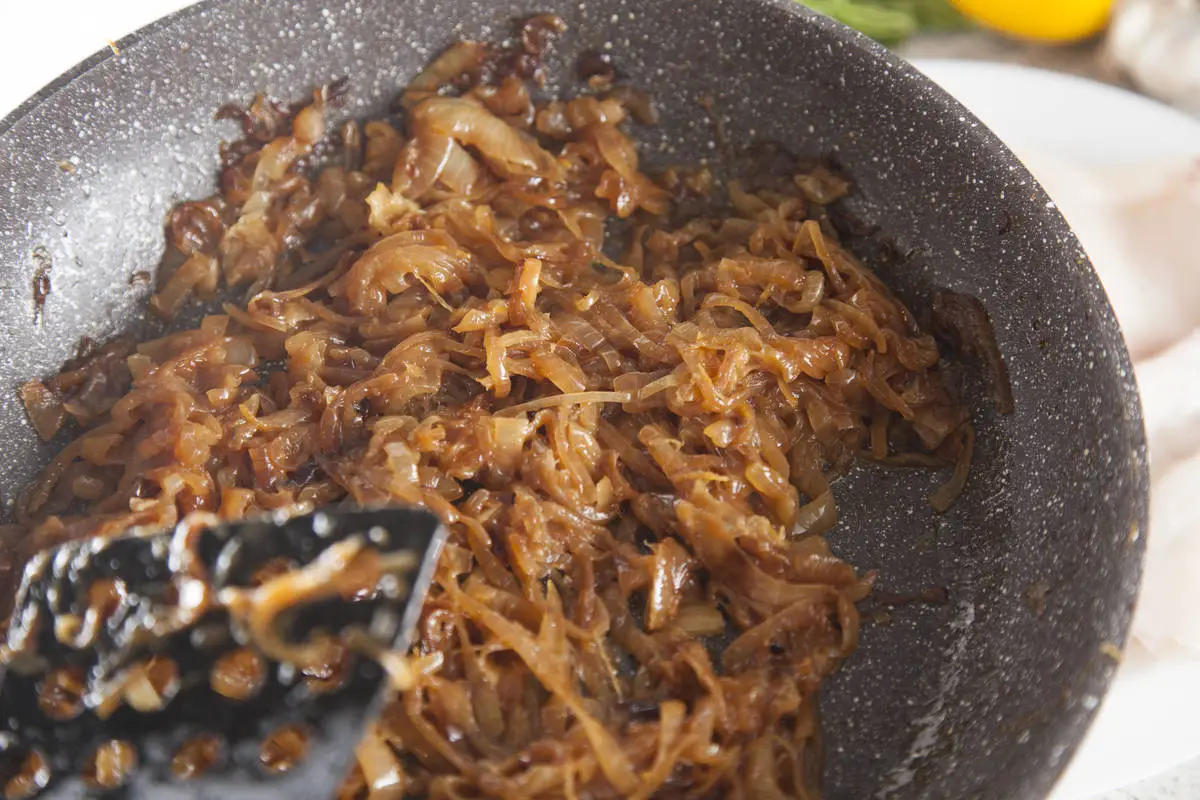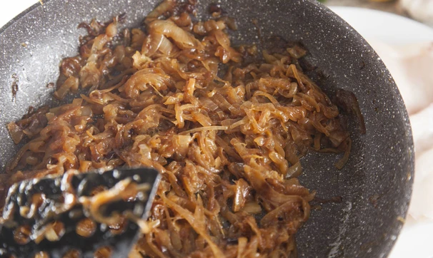 Готовый лук должен стать мягким, коричневого цвета, с карамельным ароматом. Такой лук можно хранить в холодильнике в закрытом контейнере 2 дня.