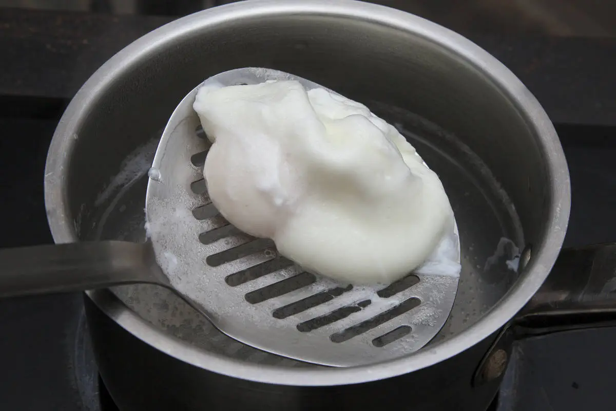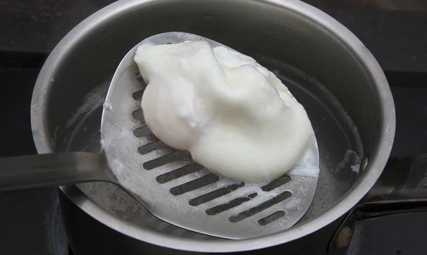 Яйцо разбейте в половник и аккуратно вылейте в воду, следите, чтобы вода не бурлила, варите яйцо около минуты, выньте при помощи шумовки и выложите на тарелку, повторите тоже самое со вторым яйцом.