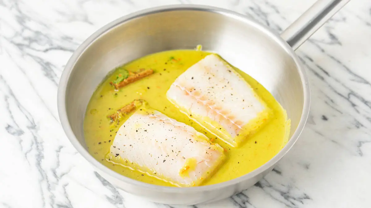 Рыбу нарежьте кусками толщиной 1-2 см. Положите в соус, накройте крышкой и готовьте на среднем огне 7-10 минут.